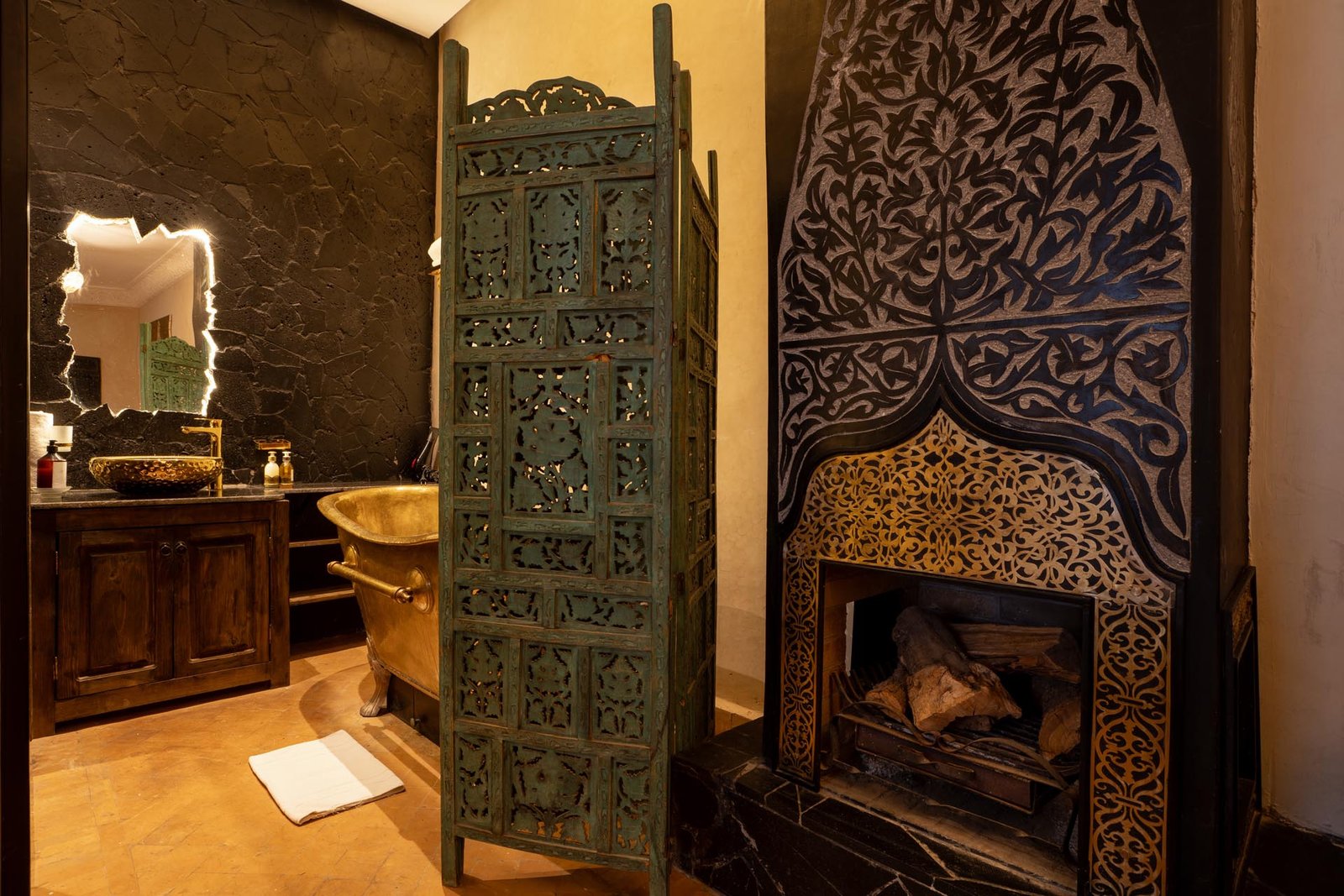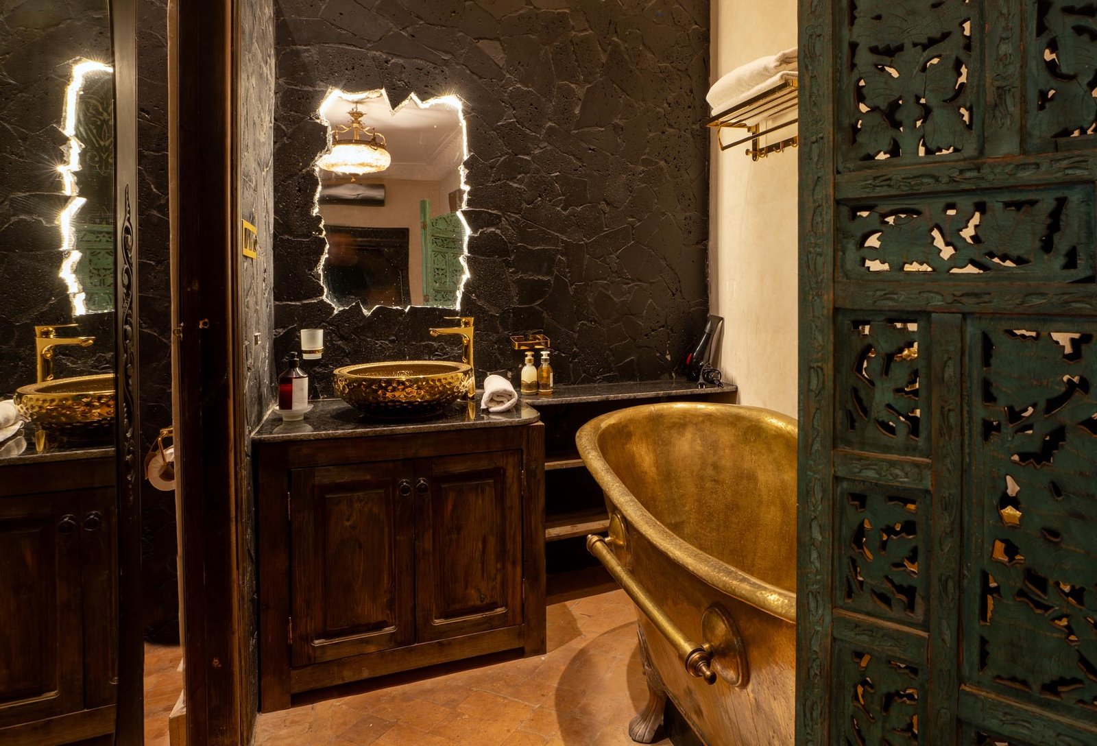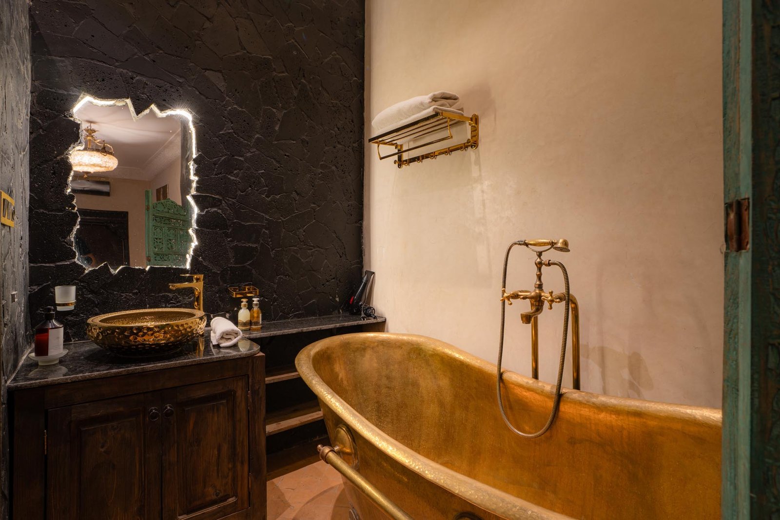 La Suite Cobre toma su nombre de sus arcos esculpidos, un verdadero símbolo del arte constructivo de Marrakech. Estas formas redondeadas aportan suavidad y elegancia al espacio, creando una atmósfera relajante. Las paredes de tadelakt, las alfombras artesanales y la iluminación tradicional realzan el encanto de la suite y se armonizan con una decoración contemporánea.