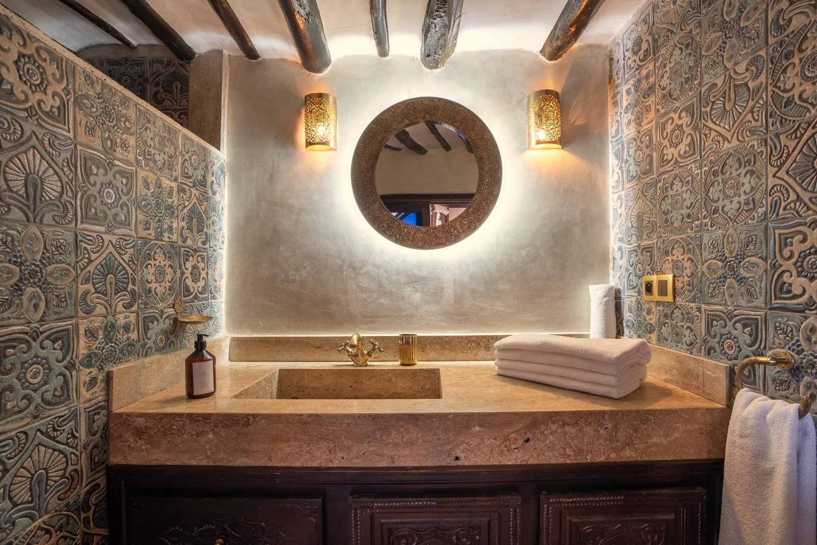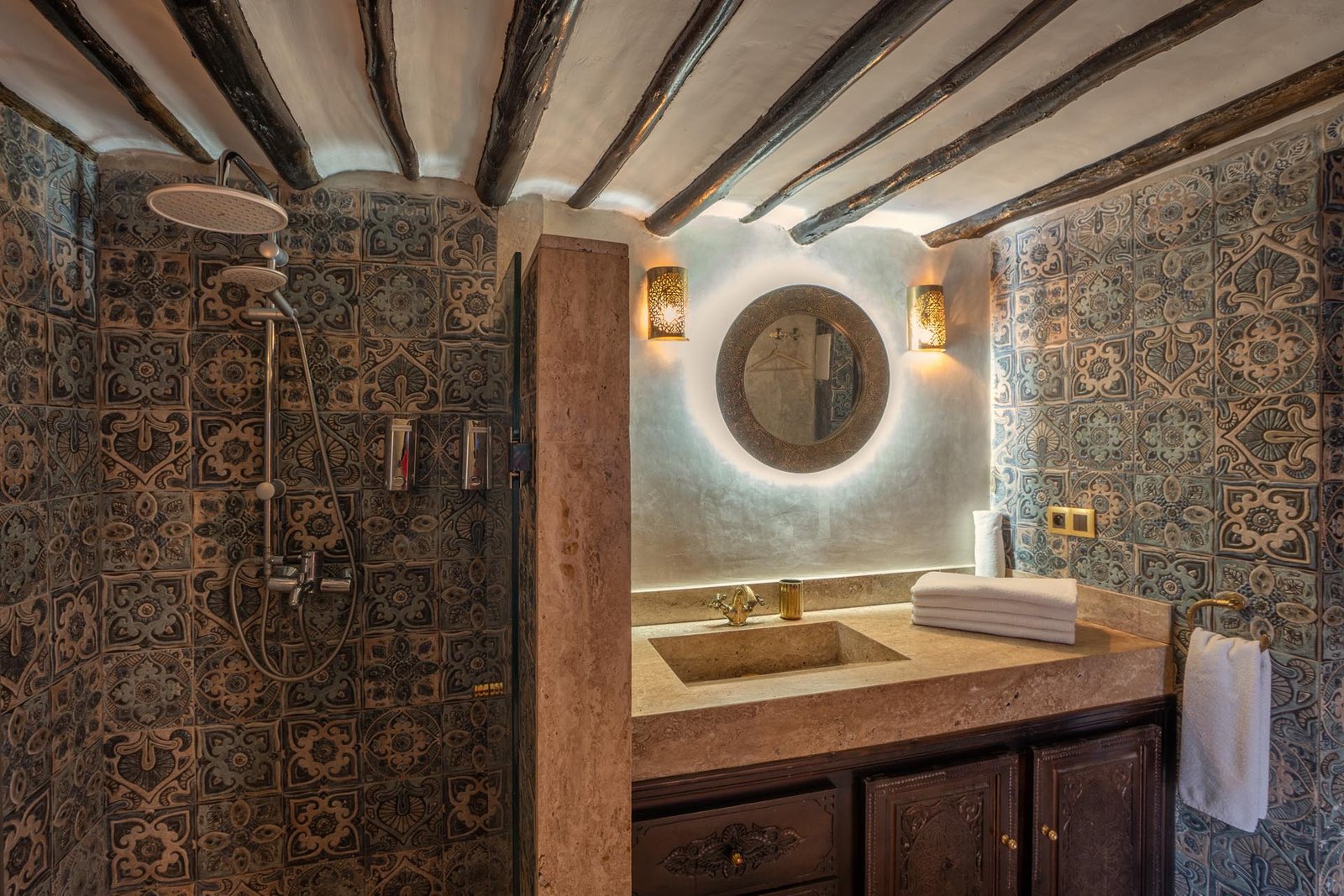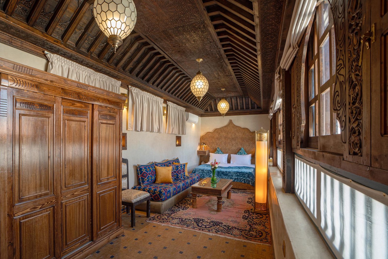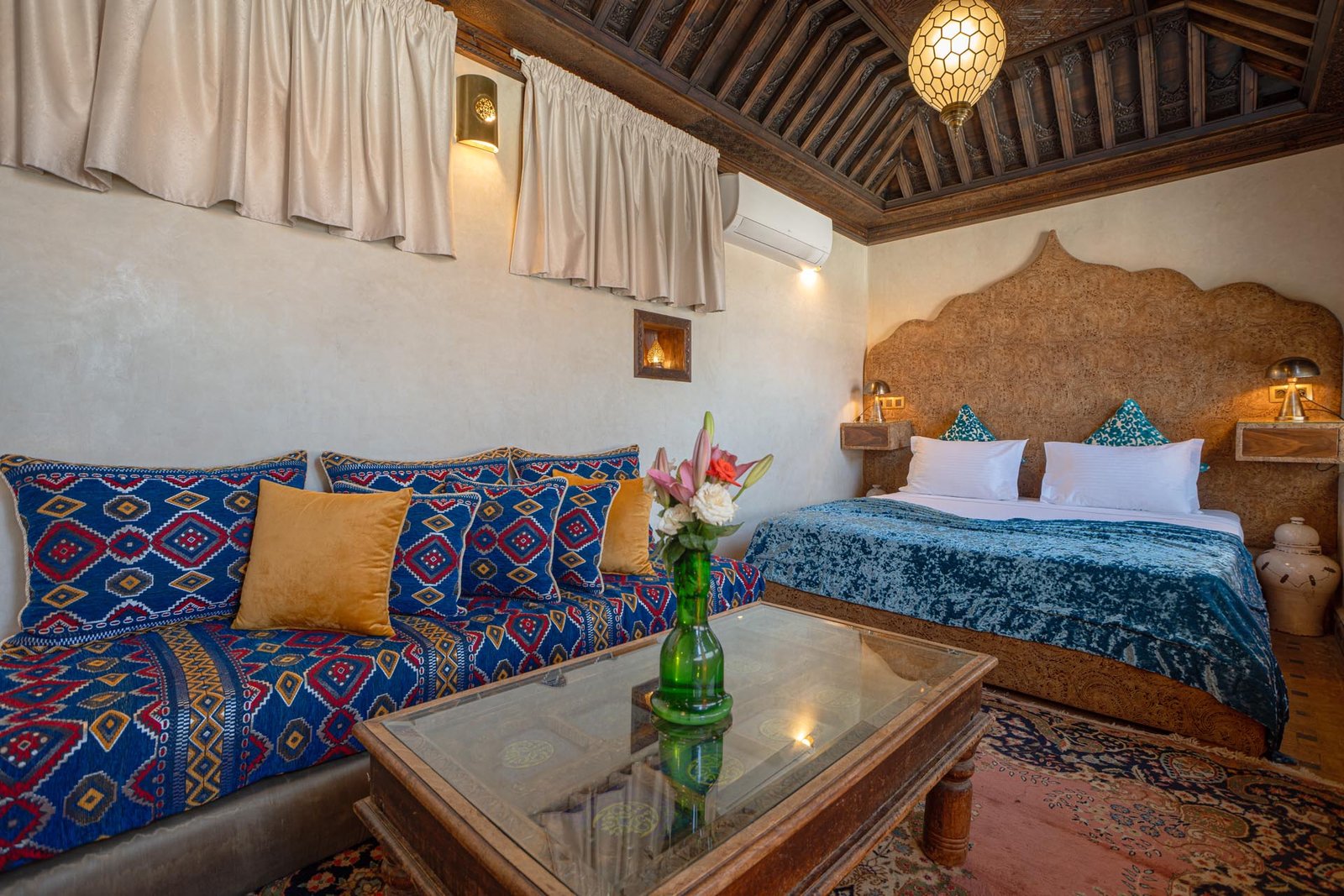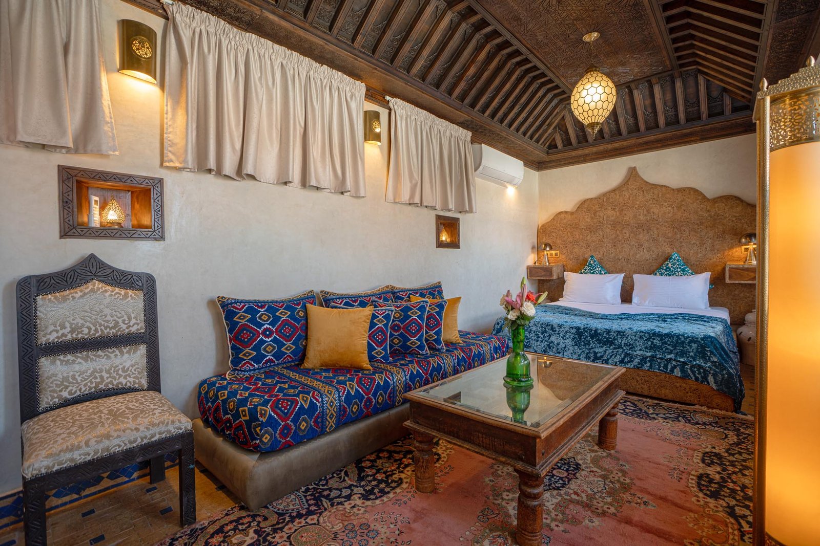 Véritable joyau du riad, la Suite Signature célèbre l’élégance de l’artisanat marocain dans un cadre à la fois raffiné et enveloppant. Son plafond en bois finement sculpté, ses fenêtres ouvragées et ses lanternes traditionnelles diffusent une lumière douce qui sublime chaque détail et crée une atmosphère intime, propice au repos et à l’évasion.